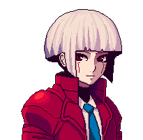 Lexi is a pale skinned woman with a white bowl cut and dark eyes with similarly colored vertical stripe marks on her cheeks beneath each eye. She wears a bright red high collared jacket with pronounced shoulders, a white collared shirt, and a blue necktie.