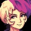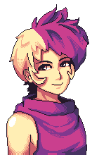 TOMCAT has an androgynous face with hair coloured purple on one side and blond on the other. They wear a loose fitting purple sleeveless top and are always seen smiling.